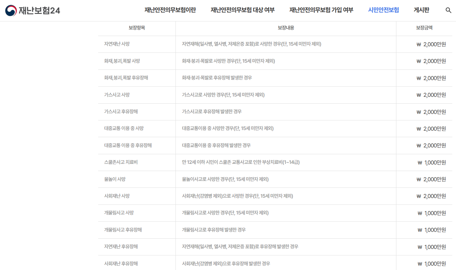 보장 범위는 지역별로 다를 수 있으므로, 재난보험 24 사이트에 방문하여 거주하는 지자체의 시민안전보험 내용을 확인해 두고 필요할 때 누릴 수 있는 혜택을 놓치지 않기를 바랍니다.
